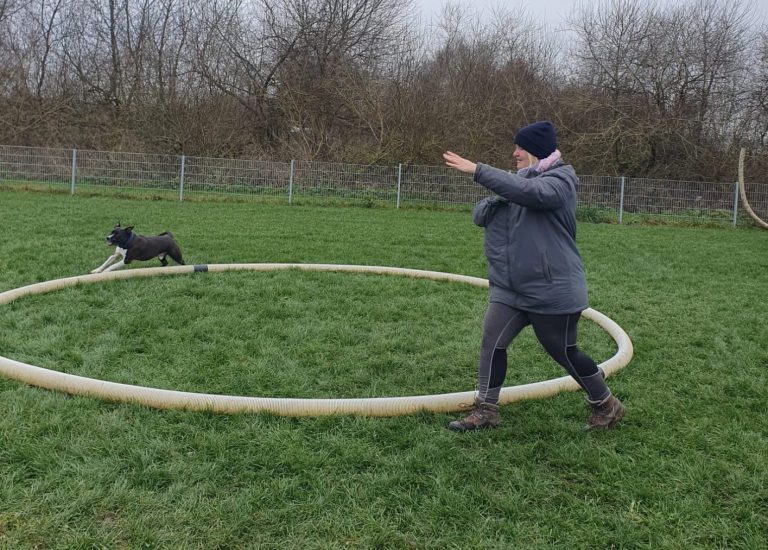 Beim Longieren führst du deinen Hund an der Außenseite eines Kreises entlang, während du dich innerhalb des Kreises befindest. Dabei wird dein Hund durch Körpersprache, Stimme und gelegentlich auch durch ein Signal gelenkt – entweder noch mit der Leine zur Absicherung oder bereits ohne Leine.