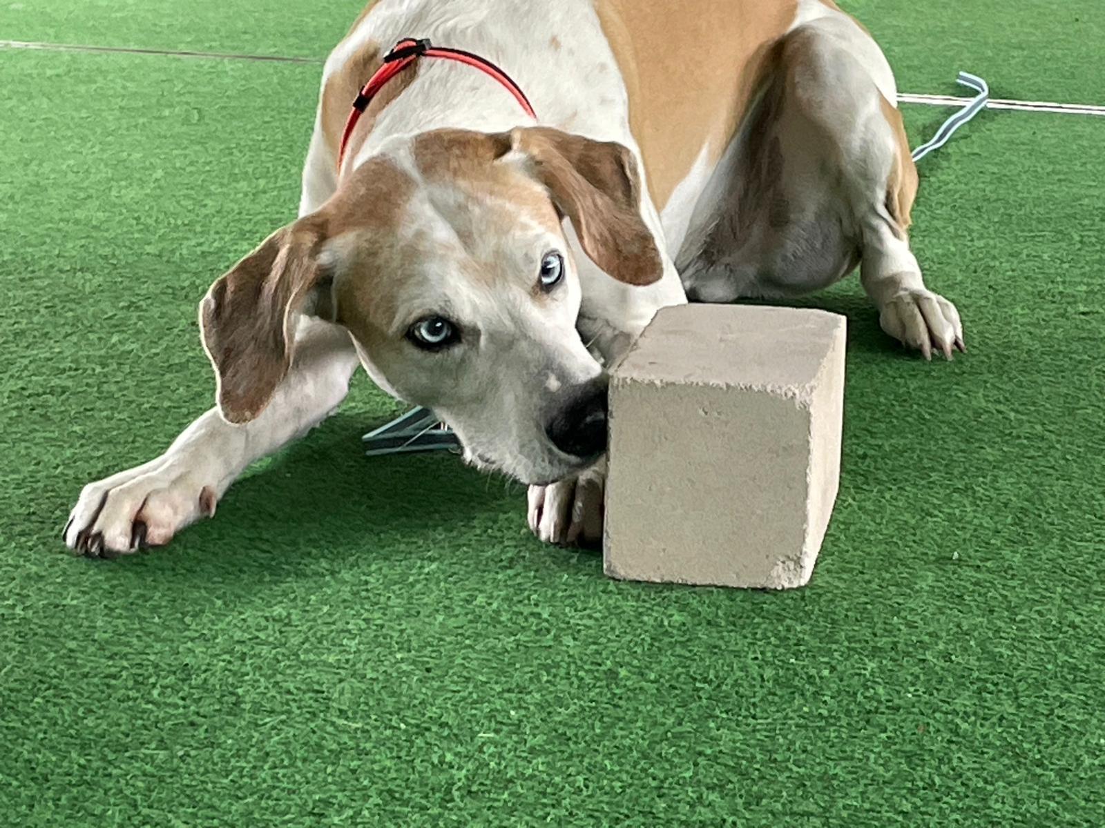 Anzeige: Das Verlängern des Anzeigeverhaltens trainieren wir am Lochstein. Durch zahlreiche und flüssige Wiederholungen wird die Anzeige langsam automatisiert. Das schnelle Hinlegen üben wir mit dem Nasentarget.